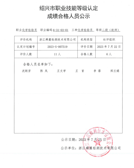 技师成绩合格人员公示
